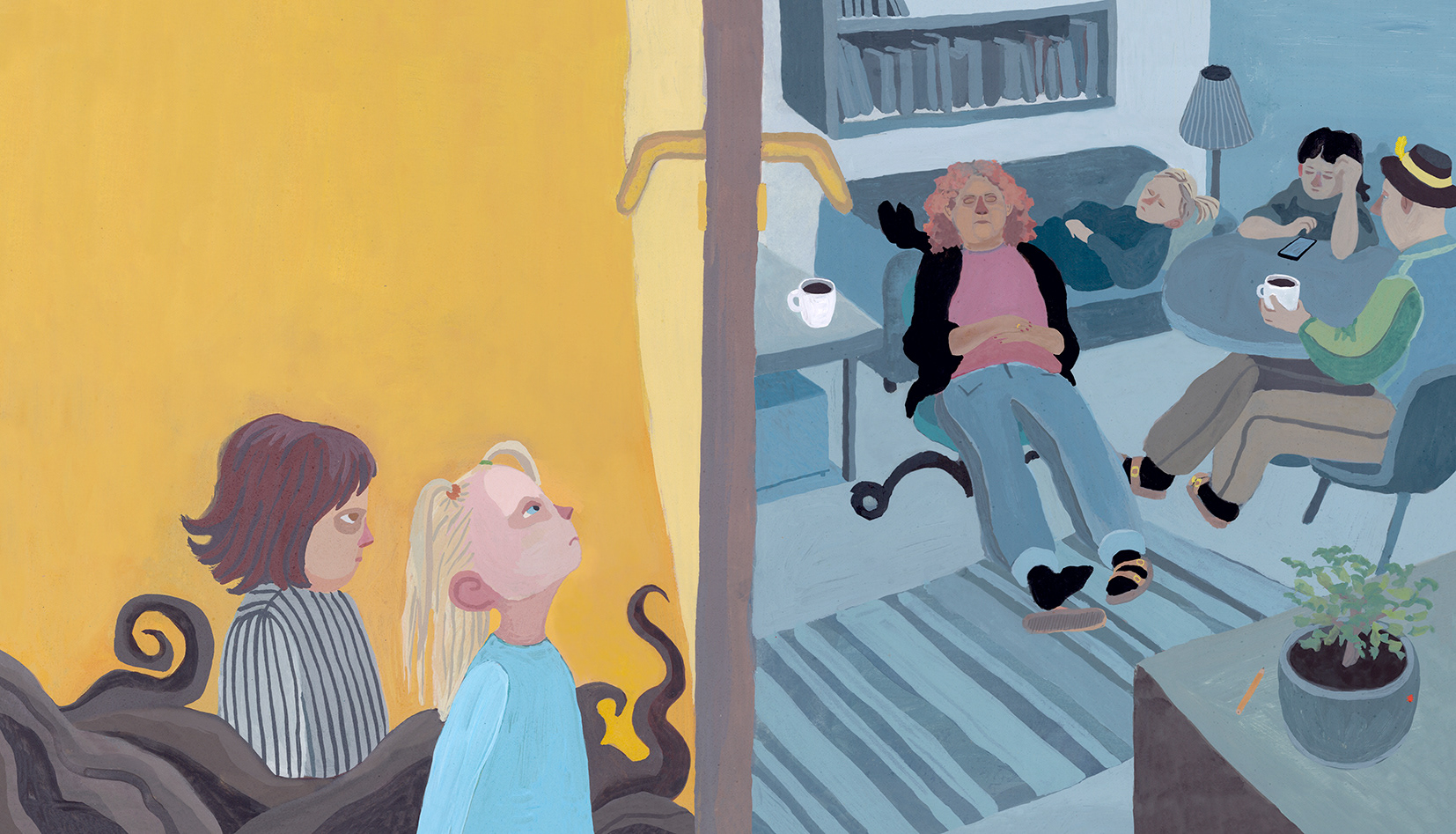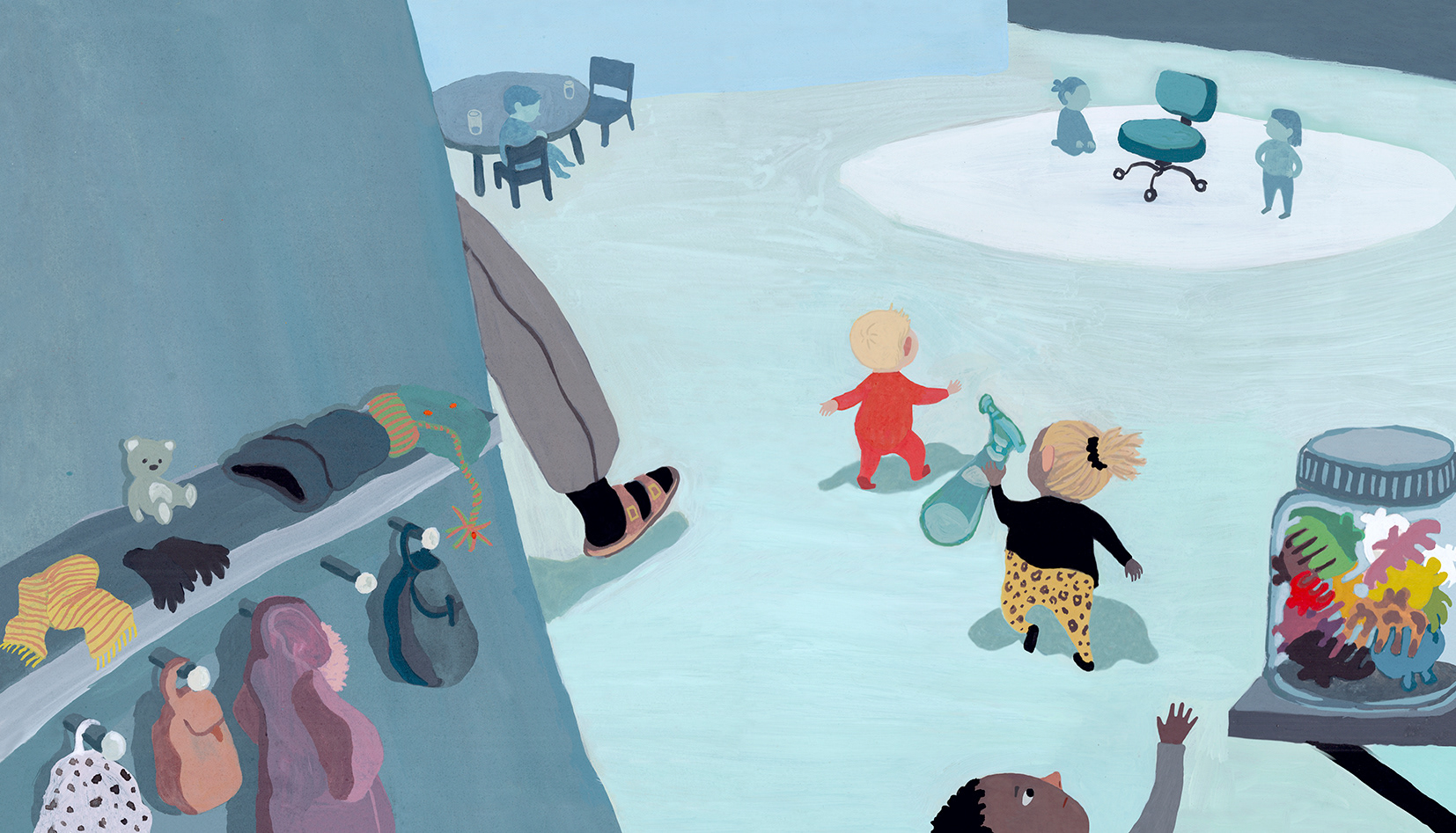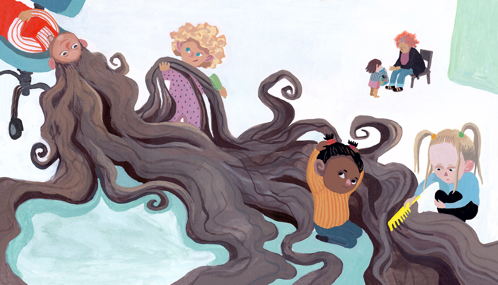 "Frisörfredag är bästa dan. Då rullar vi fram snurrstolen och alla köar för att få nya frisyrer. Och för att snurra! Men den här fredan ändras reglerna. Miryam rullar iväg stolen! Utan att säga nåt. Vi fattar ingenting.